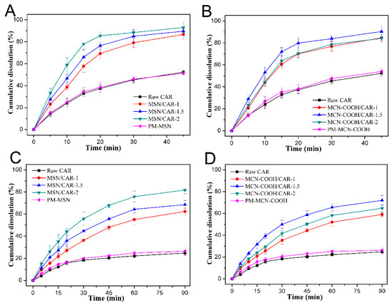 In vitro dissolution tests of micronized CAR and drug-loaded samples were also conducted in SIF, as shown in Figure 6C,D. CAR has pH–dependent solubility due to its weakly basic nature [26]. The dissolution rate of micronized CAR was quite slow in SIF, and the cumulative percentage of dissolved CAR within 90 min only reached about 24%. The physical mixtures of PM–MSN and PM–MCN–COOH both showed similar dissolution properties to crystalline CAR, but the dissolution rates of CAR from all the MCN–COOH preparations markedly improved compared with that from raw CAR. Furthermore, MCN–COOH/CAR–1.5 exhibited the fastest dissolution rate among the different MCN–COOH preparations in SIF.