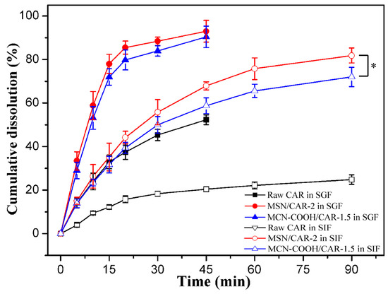 The dissolution profiles of raw CAR, MSN/CAR–2, and MCN–COOH/CAR–1.5 in SGF and SIF are shown together in Figure 7. A significant improvement (about 3.5–fold) in the cumulative dissolution rate of MSN/CAR–2 compared with that of micronized CAR was observed in SIF within 90 min, which was more obvious than the increase in SGF. Interestingly, the cumulative dissolution percentage of MCN–COOH/CAR–1.5 was lower than that of MSN/CAR–2 in SIF at 90 min, and the significant differences were found with a p value less than 0.05. This may be attributed to the strong π–π stacking interaction between CAR and MCN. Meanwhile, the dissolution rate of MCN–COOH/CAR–1.5 was similar to that of MSN/CAR–2 in SGF, and no significant difference was found. Because CAR is a weakly alkaline drug and has relatively high solubility in SGF, the difference in dissolution between MCN–COOH/CAR–1.5 and MSN/CAR–2 was inconspicuous in SGF.
