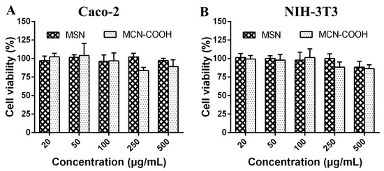 The cytotoxicity of MSN and MCN–COOH is an important factor in evaluating their future clinical applications. In vitro cell cytotoxicity assay (MTT) was used to estimate the biocompatibility of MCN–COOH and MSN using Caco-2 cells [27,28] and normal NIH-3T3 cells. The caco-2 cell line is a continuous line of human epithelial colorectal adenocarcinoma cells and is widely used as model cells for oral drug delivery. NIH-3T3 cell is a mouse embryo fibroblast cell line. The result is shown in Figure 8A,B. Negligible cytotoxicity was observed after incubation of caco-2 cells with different concentrations of MSN and MCN–COOH from 20 to 500 μg/mL, and the viability levels of caco-2 cells were 97.2% and 89.1% even at the highest concentration of 500 µg/mL MSN and MCN–COOH, which is a sufficiently high concentration for future applications. Additionally, the cell viability of NIH-3T3 cells incubated with MSN and MCN–COOH for 24 h was above 80% within the tested concentration range. These results indicated that MSN and MCN could be used as safe carriers for oral drug delivery.