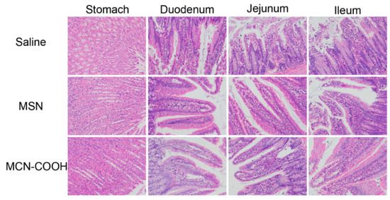 A gastrointestinal mucosa irritation test was carried out to evaluate whether the carriers are safe after oral administration. Comparisons were made with a saline group, and no hyperemia or histopathological lesions were observed after oral administration of MSN and MCN–COOH suspension (Figure 9). Furthermore, no unusual behaviors or death of mice were observed during the irritation experiment. Therefore, it was confirmed that the MSN and MCN–COOH showed good tissue compatibility in vivo and could be applied in oral administration.