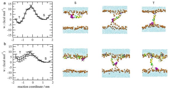 - Gumbart, J.C.; Ulmschneider, M.B.; Hazel, A.; White, S.H.; Ulmschneider, J.P. Computed Free Energies of Peptide Insertion into Bilayers are Independent of Computational Method. J. Membr. Biol. 2018, 251, 345–356. [Google Scholar] [CrossRef]