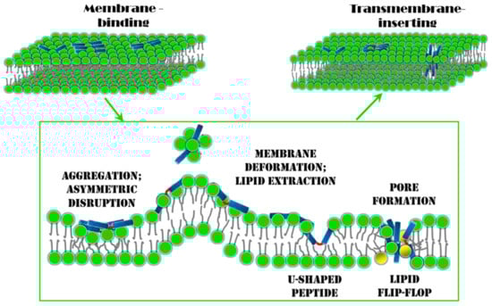 - Huang, H.W. Action of Antimicrobial Peptides: Two-State Model. Biochemistry 2000, 39, 8347–8352. [Google Scholar] [CrossRef]