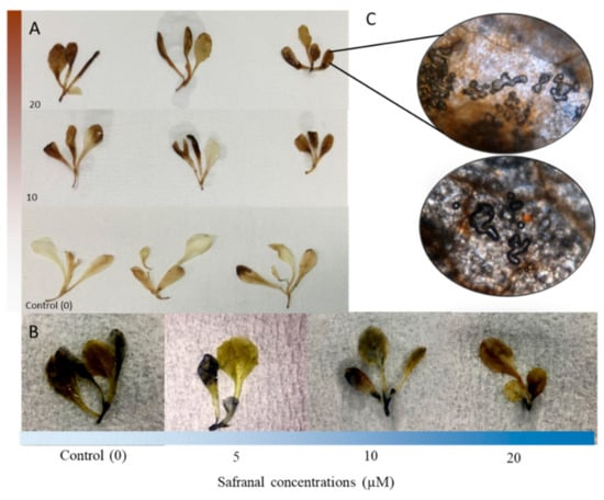 Visualization and quantification of H2O2 were performed according to previously described methods by Lee et al. [45] and Li et al [46], with some modifications. Week-old L. sativa seedlings were exposed to different concentrations of safranal (0, 5, 10, and 20 µM, SAFC, ≥88% Sigma-Aldrich) in a plant box container as described previously. After 48 h, the seedlings were cut from the collar and weighed. All samples were then placed in 10 mL polyethene falcon tubes containing 5 mL DAB solution (1 mg mL−1 DAB, Sigma catalogue number: D8001, pH 3.8 adjusted with HCl) with the caps removed in a vacuum desiccator and vacuum-infiltrated for 30 min at room temperature with DAB. Samples were then incubated in the dark overnight. The excess stain was washed with distilled water, and plant segments were placed on paper towels saturated with a fixative solution (ethanol: acetic acid, 3:1, v/v) in a petri dish and were kept in the dark for 24 h. All segments were washed off with distilled water to remove chlorophyll. Segments were transferred to paper towels saturated with water and left for 30 min to remove any fixative residues and then were photographed (Figure 2). Samples were kept in glycol a lactoglycerol solution (lactic acid: glycerol: H2O 1:1:1, v/v/v) for further examination. To evaluate the H2O2, L. sativa seedlings were vacuum-infiltrated with DAB (1 mg mL−1 DAB, Sigma pH 3.8 adjusted with HCl) for 10 min and then incubated in a shaker for another 1 h at 37 °C. The stain was pounded off, and chlorophyll was removed with ethanol (80%) for approximately 20 min. Plant segments were immediately homogenized in 1 mL of 0.2 M perchloric acid (HClO4) in a pre-chilled pestle and mortar and incubated in ice for 5 min. Samples were centrifuged (10,000× g, 10 min at 4 °C), and after collecting the supernatant, the absorbance was measured at 450 nm using spectrophotometry.