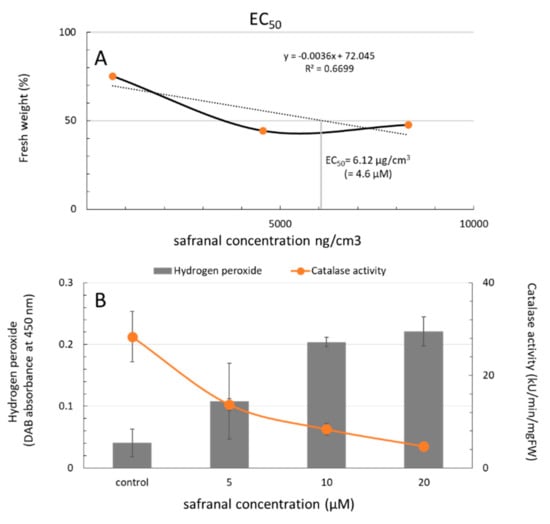 The effective concentration EC50 of volatile safranal (equivalent to ng/cm3) on the weight of L. sativa seedlings in plant box and (B) The effect of safranal on the activity of CAT enzyme and generation of reactive oxygen species (ROS): (A). Error bars indicate the mean values ± SD. Mean values are significantly different at P ≤ 0.05.