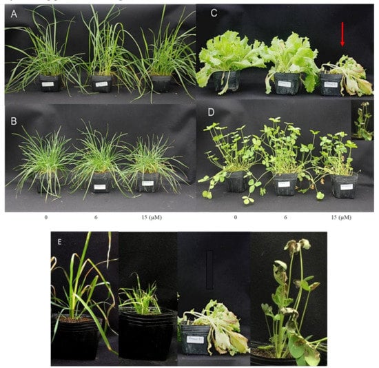 Yellow coloring and necrosis at all leaves surfaces and moving downwards (senescence indicted by arrow) in D. glomerata (A), L. perenne (B) L. sativa (C), and T. repens (D) due to a decline in chlorophyll content caused by safranal. Arrow indicates the severe damage of safranal on L. sativa leaves. (E) Yellow coloration and necrosis on tested species caused by safranal.