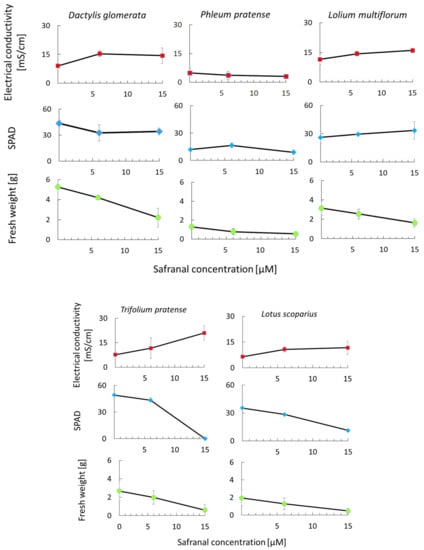 The effect of safranal on physiological parameters of L. sativa and L. scoparius and T. pratense was significant (Figure 6). The chlorophyll content (SPAD) and fresh weight of L. scoparius and T. pratense decreased significantly as safranal application rate increased. Spraying 15 µM of safranal caused severe damage to the T. pratense leading to the death of the plants after 48 h. The results corroborate the findings for L. sativa seedlings seen in Figure 6. Although the L. multiflorum SPAD, leaf electrolytes leakage, and fresh weight were slightly affected by safranal, the effect was only significant on fresh weight when 15 µM safranal was used (Figure 6). In general, L. multiflorum showed resistance to sprayed safranal. A similar trend was observed for the monocotyledons species (D. glomerata and P. pratense). However, P. pratense showed significant tolerance against the cell membrane disruption activity of safranal. This observation is due to the structure and genetic makeup of monocots, a common phenomenon, which confers resistance to allelochemical and herbicides on them [40]. Similar to other allelopathic plants and allelochemicals in the inhibition of photosynthesis, an increase in ROS, chlorophyll decline, inhibition of enzymatic activity, and plant cell membrane disruption mechanisms have been widely reported [41,42]. Additionally, compared with other synthetic herbicides, safranal might be less harmful to humans given the fact that it has been identified in many fruits and plants and has been applied as an edible flavour and food-colouring agent over centuries [43,44]. In the present study, safranal showed stronger inhibitory activity against dicotyledonous in comparison to the monocotyledons. In addition, safranal initiated a significant weight and chlorophyll content reduction in all the tested plants.