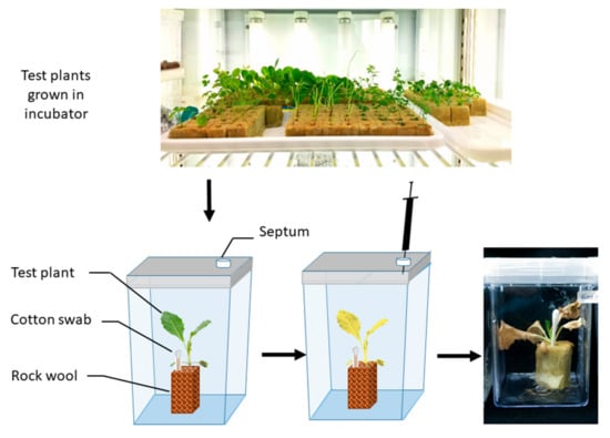 In our previous studies, we reported a methodology that could be used to evaluate the growth inhibitory effects of volatile compounds on the early stage of seedling growth [14]. However, there is a dearth of information that the method could accurately measure, including the effective concentration of a volatile allelochemical on phenotypical or physiological changes of plants in later maturation stages. Developing a small-scale system that can estimate the concentration of volatile compounds and their associated response in plants is an essential need in the field of allelopathy.