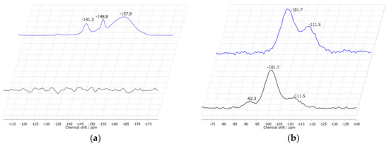 CP/MAS 19F (a) and CP/MAS 29Si (b) solid-state NMR spectra. Black line: SiO2(c). Blue line: SiO2(c)F. All spectra were collected at a spin rate of 10 kHz. The chemical shift value at the top of the peak is indicated by the curve.