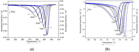FSC (a) and DSC (b) heat flow normalized to cooling rate for non-isothermal crystallization from the melt at different cooling rates, considering samples with a mass of ~27 ng and ~4 mg respectively. Black: PTFE, blue: PTFE/SiO2(c)F. The cooling rate of each experiment (in K·s−1) is indicated by each curve.