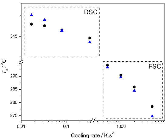 The thermoanalytical curves represent the data obtained at slow and fast cooling rates during DSC and FSC measurements. According to the results, the crystallization peak is normally shifted to a lower temperature with increasing cooling rate. Besides, it appears for both samples that the exothermal crystallization peak is not symmetrical for slow cooling rates. This asymmetry can be explained by a transition from a primary to a secondary crystallization process [20,38,39]. Yet, it must be stressed that the peaks remain symmetric at fast cooling rates, indicating that the secondary crystallization process is limited in this case. This indicates that the crystals formed under fast cooling rates cannot reach a sufficient development of their structure and are not able to start the secondary crystallization process. Indeed, we have previously shown that PTFE crystals formed under fast cooling present one single melting peak contrary to crystals formed under sufficiently slow cooling which presented a well-marked shoulder. It suggested that fast cooling did not permit secondary crystallization to occur. These PTFE crystals formed under fast cooling presented an axialite morphology which does not favor the secondary crystallization as the lamellae appear to be thinner and do not have sufficient time to form perfectly, [40] contrary to spherulite or ribbon morphology that present thicker lamellae. The variations of Tc displayed in Figure 4 between the two samples present similar amplitudes as the variation amplitudes of Tc observed in the study of Smith et al. [41] on Poly(trimethylene terephthalate) that were employed for kinetics analysis. Figure 5 displays the values of Tc measured by non-isothermal DSC and FSC measurements during crystallization from the melt for the two samples.