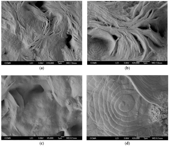 The PTFE/SiO2(c)F crystalline morphology formed from the melt after a cooling rate of 100 K·s−1 is displayed in Figure 6a,b. It can be observed from the micrographs that several crystals present a rod-like or needle-like shape. However, compared to the results obtained for the neat PTFE [9], two-dimensional crystallites have also developed and display a disc-like shape. This shows that the nanosilica clusters promote the nucleation and the diffusion of crystal chains with the formation of two-dimensional structures even under relatively fast cooling rates. The PTFE/SiO2(c)F crystalline morphology formed from the melt after a cooling rate of 0.1 K·s−1 is presented in Figure 6c,d. The micrographs clearly show that the crystals exhibit ribbon-like structures arranged into concentric discs or spirals. These structures formed at the slow cooling rate are obviously different from the rod-like structure observed after the fast cooling rate. Compared to the crystals of neat PTFE [9], the crystals in the nanocomposite display disc structures with a smaller diameter but are more numerous. This attests that the number of nucleation centers is enhanced by the presence of nanosilica clusters and confirms the promotion of PTFE nucleation.