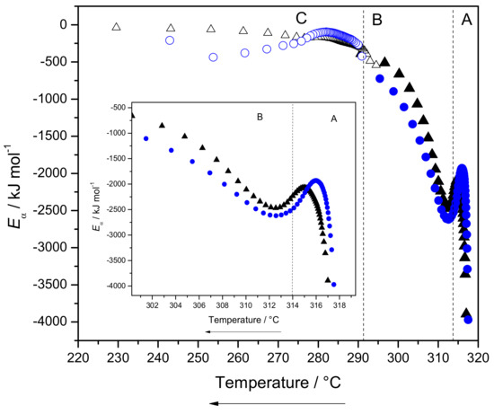 Eα dependence vs. temperature computed from FSC and DSC data. Black triangles: PTFE; blue circles: PTFE/SiO2(c)F; open: Crystallization performed at the FSC cooling rates 500, 1000, 2000 and 5000 K·s−1; solid: Crystallization performed at the DSC cooling rates 0.0167, 0.0333, 0.0833, and 0.3333 K·s−1. Inset: Magnification of Eα vs. T curve in the temperature range of 300–320 °C.