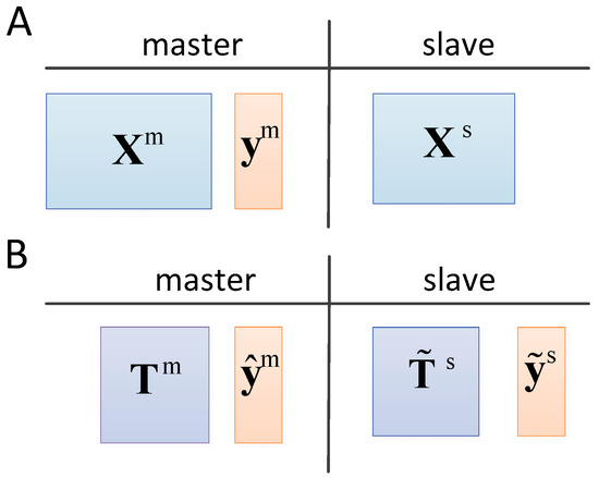 Data setting of the calibration transfer method based on affine invariance without transfer standards (CTAI). We assume the data to be available in (A), and the data after being processed based on PLS model of the master instrument is shown in (B).