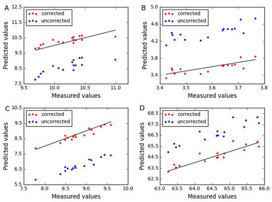 The relationship between the uncorrected and the corrected predict values for corn dataset by (A) moisture, (B) oil, (C) protein and (D) starch. The blue and red dots represent the uncorrected and the corrected predicted results for each sample, respectively.