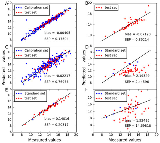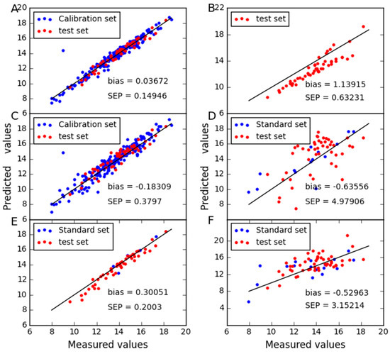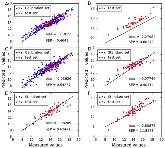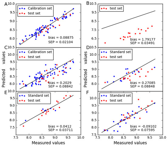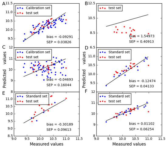 To further display the predictive abilities of different models, the correlation between measured and predicted values obtained in Figure 8, Figure 9 and Figure 10. Zero differences between measured and predicted values result in points over the straight line of the plot. It can be seen that good correlations are found between expected and predicted concentrations, which confirm the good performance of CTAI. CTAI achieved the lowest standard error for three combinations. Moreover, the predictive abilities of PDS and CCA are poor for wheat dataset. For SBC, PDS and CCA, they require standard samples and TCR requires reference values of the slave instrument samples, both of which are expensive and difficult to obtain. Obviously, this means that CTAI shows much more outstanding performance.