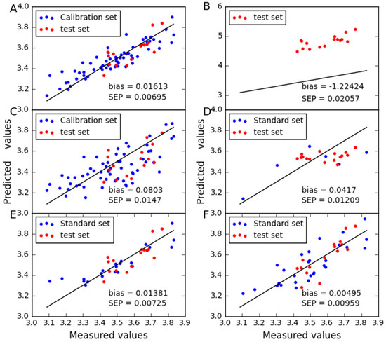 With the characteristics of high efficiency, low cost and non-destructivity, near-infrared (NIR) spectroscopy has been widely used in control of food and pharmaceutical quality [1,2,3,4]. Multivariate calibration methods are commonly used to obtain quantitative or qualitative information from near-infrared spectra, such as principal component regression (PCR) [5,6] and partial least squares (PLS) [7,8,9,10]. Since changes of the instruments and measurement conditions may result in poor applicability of the model. Recalibration can be utilized to solve this problem, but recalibration is time consuming and takes an immense amount of work. In order to reduce consumption of the recalibration, calibration transfer has been widely studied and applied [11]. There are two main situations about calibration transfer: (1) The uniform calibration model is used to predict spectra being measured on multiple instruments; (2) the new spectra are measured on the same instrument after a period of time.