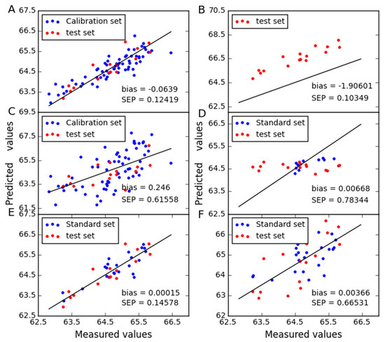 Starch content predicted for corn dataset as determined by (A) CTAI, (B) MSC, (C) TCR, (D) CCA, (E) SBC and (F) PDS. The blue and red dots represent the results for each sample in the train set and test set, respectively.