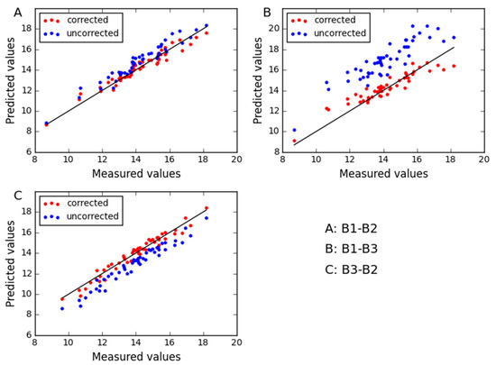 The relationship between the uncorrected and the corrected predict values for wheat dataset by (A) B1-B2, (B) B1-B3 and (C) B3-B2. The blue and red dots represent the uncorrected and the corrected predicted results for each sample, respectively.