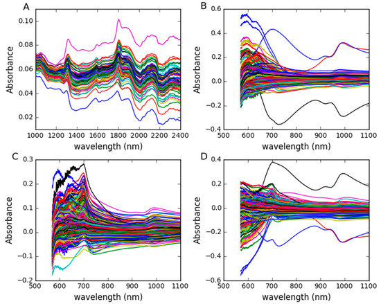 The wheat dataset was used as the shootout data for the International Diffuse Conference 2016, and the protein content was chosen as the property. Related information about the wheat dataset at http://www.idrc-chambersburg.org/content.aspx?page_id=22&club_id=409746&module_id=191116 can be easily accessed. 248 samples of the wheat dataset from three different NIR instrument manufacturers (B1, B2 and B3) were analyzed. According to KS algorithm, 198 samples were chosen as the calibration set and the remainder of samples formed the test set. The wavelength range is 570–1100 nm with an interval of 0.5 nm. The spectral difference between B1 and B2 is shown in Figure 11B. The spectral difference between B1 and B3 is shown in Figure 11C. The spectral difference between B2 and B3 is shown in Figure 11D.