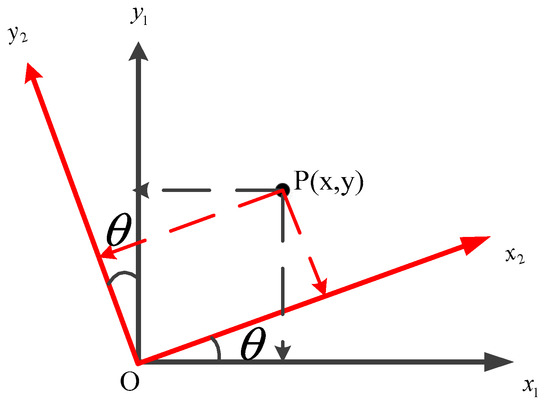 Point P in the original coordinate system (black) is (x, y). A counterclockwise rotation of the point P is equivalent to clockwise rotation of the coordinate system. Thus, the point P in the black coordinate system is equivalent with the point P in the red coordinate system after the rotation. Based on this conclusion, we can determine the coordinates of the point P by simple stereo geometry, and then add the offset of the X-axis and the Y-axis based on this position; the formula is as follows: