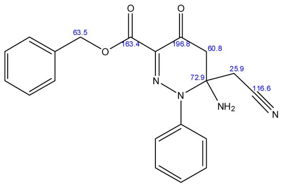 The structures of compounds 13a–c were confirmed by spectroscopic analysis. Compound 13a had an m/z value of 362.53. The 1H NMR spectrum of 13a revealed two multiplets for the prochiral CH2-CN at δ = 1.28 and 1.31 ppm. A two multiplets for the prochiral ring methylene protons COCH2 appears at δ = 2.39 and 2.49 ppm. A singlet at δ = 4.30 ppm is assigned for two methylene protons, a multiplet at δ = 7.10 ppm for the aromatic 10H, and two singlets for the four NH2 protons at δ = 11.56 ppm and 14.22 ppm, respectively. The 13C-NMR spectrum of compound 13a showed a signal at δ = 196.8 ppm significant for a true carbonyl, assigned to the pyridazine ring carbonyl, and showed another signal at δ = 163.4 ppm for the ester carbonyl. The CH2CN methylene carbon appears at δ = 25.9 ppm. Figure 3 indicates the most important 13C-NMR signals for 13a.