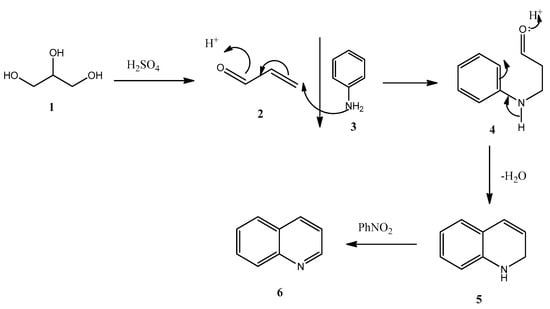 One of the oldest utilities of glycerol in organic chemistry is the synthesis of quinolines in poor yields, known as the “Skraup synthesis of quinolines” [,]. Skraup’s synthesis of quinolines has many limitations other than the low yield, including the multi-step addition of the reactants, in which glycerol must first react with H2SO4 to yield the hazardous acrolein (propenal), which is followed by the addition of the aromatic amine to form hydroquinoline that is converted to the quinoline by adding an oxidizing agent as the final step (cf. Scheme 2).