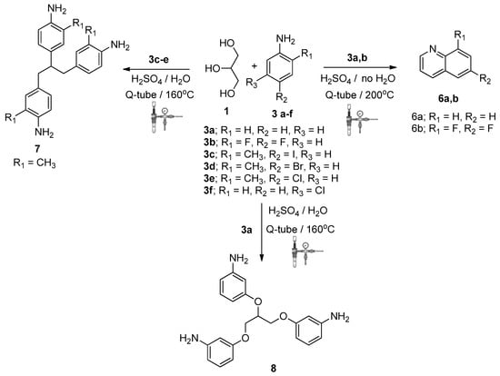 Reaction of aromatic amines, glycerol, and sulfuric acid in the presence/absence of water, under a high pressure, and high temperatures in the Q-tubes.