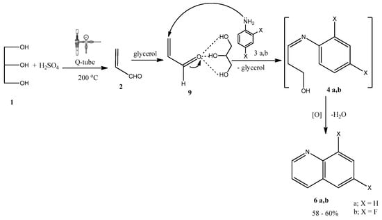 While acrolein is a minor product of the dehydration of glycerol under neutral hydrothermal conditions, it becomes the main product when an acid catalyst is added, but at temperatures above 340 °C using conventional heating []. Under pressure, we could achieve the same results but at much lower temperatures. Thus, using Q-tubes and heating at only 200 °C for 1 h, we could prepare quinolines in high yields. Recently, the catalytic role of glycerol via H-bond was published by Hamid and coworkers []. We think that, in our work, the reaction proceeds via a typical Skraup reaction mechanism, but with glycerol having a dual role where one mol of glycerol acts as a starting material reacting with H2SO4 to produce acrolein 2, and another mol of glycerol acts as a catalyst and bounds via H-bond with acroline to generate complex 9. This then undergoes a Michael addition with the aromatic amines (3a, b). This is followed by the release of glycerol once more to produce the intermediate 4a, b that then cyclizes to 6a and 6b, respectively. Scheme 4 shows a suggested reaction mechanism for the formation of quinoline 6a, b. In our reaction conditions, there were no need to add any oxidizing agents since we believe that concentrated H2SO4 acts as a condensation agent and an oxidant.
