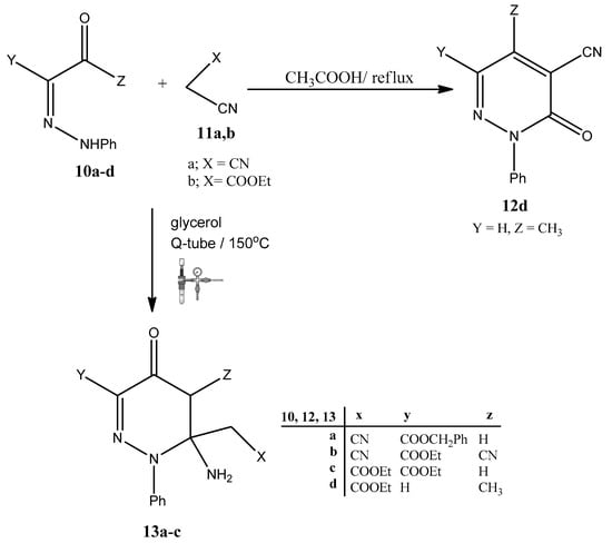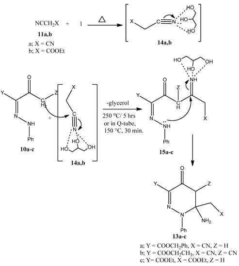 Subsequently, we shifted to utilizing glycerol in the synthesis of pyridazines. The pyridazine ring is an important structural feature in a number of pharmaceutical compounds, such as hydralazine (brand name Apresoline, vasodilator, US, FDA), cefozopran (anti-bacterial agent, Japan), and pipofezine (brand name Azafen or Azaphen, antidepressant, STADA, Nizhny Novgorod, Russia). Pyridazine derivatives have been reported to possess various pharmacological activities and intermediates for drugs synthesis, including antimicrobial, analgesic, anticancer, antitubercular, antidiabetic, antifungal, antihypertensive, anticonvulsant, anti-HIV, antiasthma, anti-inflammatory, phosphodiesterase (PDE) inhibitors, cyclooxygenase (COX) inhibitors, antipyretic, insecticidal, and neurological [,,,,,,,]. The reaction of arylazo 10d and ethylacetoacetate 11b in either acetic acid or ethanolic KOH, followed by reflux to afford pyridazinones 15d, has been reported. This reaction was limited to the formation of 12d, and was not consistently successful and Trials to form 12a failed, since malononitrile dimerized under these conditions [,]. In this case, we could efficiently prepare pyridazinones 13a–c in good yields, by the reaction of malononitrile 11a, phenylhydrazono esters 10a–c, and glycerol, either under conventional heating at 250 °C for 5 h, or under pressure in the Q-tubes at 150 °C for 30 min (cf. Scheme 5).