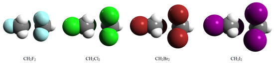 Throughout the following section, we present a detailed theoretical analysis for methylene halide (, , , and ) dimers describing their intermolecular interactions and dimer configurations. A suite of a selected common configuration for methylene halide dimers considering their atomic volumes is presented in Figure 1.
