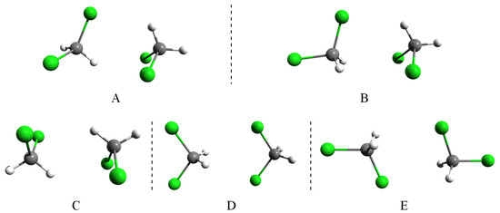 Relative orientation of the methylene halide monomers in the five stable dimer configurations (A—asymmetric; B—plane-symmetric; C and D—with C point group symmetry and E—with C point group symmetry).