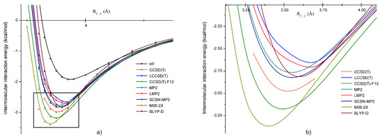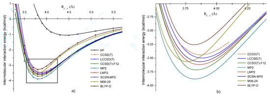 In the case of methylene chloride (or dichloromethane), all five dimer configurations were found. The strongest bounded dimer was A, while the weakest one was the E configuration. For the five methylene chloride dimers, the interaction energy diminishes in alphabetic order. The interaction energies at the HF, LMP2, and LCCSD(T) levels of theory, as well as the C⋯C bond distances and dipole moments were presented in our previous work [86]. Here, we continue to characterize the intermolecular interaction of the B dimer considering further theoretical methods such as the coupled-cluster theory with singles, doubles, and perturbative triples excitation CCSD(T) and its explicitly-correlated approximations (CCSD(T)-F12), the canonical MP2 with BSSE correction, the spin-component scaled MP2 for nucleobases, and the dispersion corrected DFT (empirically-corrected BLYP-D and M06-2X exchange-correlation functionals) methods and compare the results obtained by them. The CCSD(T) theory was taken as a reference for comparison with the other theoretical methods.