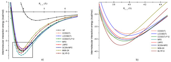 The potential energy curves obtained with these methods are shown in Figure 3. Generally, one can conclude that all applied methods gave bounded structures for the B dimer geometry of . In the first step, the coupled-cluster methods were compared, where, in addition, two different approximations of explicitly- (F12) and local-correlation (L) were also considered. Since the canonical CCSD(T) calculation together with the aug-cc-pVTZ basis set requires large computational effort, the IIEs were calculated only for five representative C⋯C intermolecular bond distances (3.7, 3.8, 3.9, 4.0, and 4.1 Å) around the minimum. In the right graph of Figure 3, one can observe that the LCCSD(T) energies showed an excellent agreement with the reference curve of the CCSD(T) near the energy minimum, with an average deviation of 0.057 kcal/mol. For the CCSD(T)-F12 method, the discrepancies in the energy values were somewhat larger, and we found on average a deviation of 0.258 kcal/mol; the CCSD(T)-F12 method overestimated a bit the conventional CCSD(T) results. This difference between the CCSD(T) and the CCSD(T)-F12 energies may be due to the basis set incompleteness error, which is still present in the energy values obtained with the well-known CCSD(T)/aug-cc-pVTZ level of theory, but counted by the CCSD(T)-F12 through the F12 technique. On the other hand, one should not forget that CCSD(T)-F12 uses the density-fitting and resolution of identity techniques for speeding up the electron integral calculations, the errors of which were also present in the energy difference between the two methods. Accordingly, the real effect of the basis set incompleteness error can be estimated considering the difference between the LCCSD(T) and CCSD(T)-F12 energies (0.2 kcal/mol). If one compares the conventional MP2 results with our reference method (BSSE corrected in both cases), the well-known deficiency of binding energy overestimation for the MP2 method is confirmed again. The mean deviation for MP2 was 0.415 kcal/mol, being the largest among the methods applied for the B dimer structure of .
