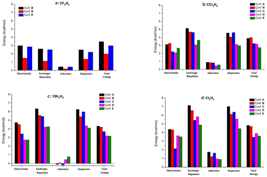 The relative contribution of different energy components (electrostatic, exchange-repulsion, induction, and dispersion) for the four methylene halide dimers (for Conf. A-E see Figure 2).