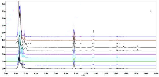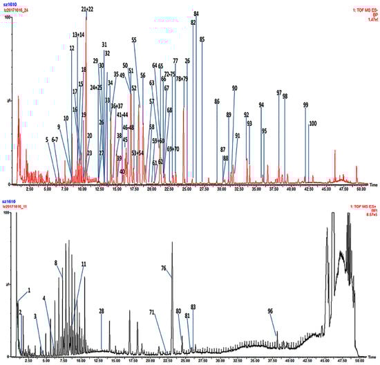 The chromatography was performed with a Waters Acquity UPLC BEH C18 column (2.1 mm × 100 mm, 1.7 µm; Waters, Milford, MA, USA) and the column temperature was maintained at 50 °C. 1 μL of the sample was used for separation. The separation was achieved using gradient elution with acetonitrile (A) and 0.1% formic acid in water (B) at a flow rate of 0.3 mL/min: 0–12 min, 5–30% (A); 12–20 min, 30–30% (A); 20–26 min, 30–38% (A); 26–29 min, 38–38% (A); 29–31 min, 38–43% (A); 31–34 min, 43–51% (A); 34–40 min, 51–51% (A); 40–44 min, 51–81% (A); 44–46 min, 81–100% (A); 46–48 min, 100–100% (A).