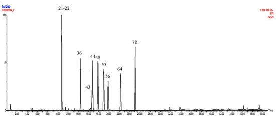 The representative based peak intensity (BPI) total ion chromatogram from a sample of Shengmai injection (SMI) based on ultra-performance liquid chromatography tandem quadrupole time-of-flight mass spectrometry (UPLC-QTOF-MSE).