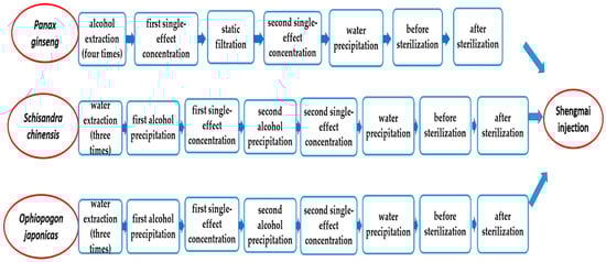 Based on the core concept of Q-markers, a strategy for quality evaluation based on components transfer process analysis is discussed in this paper. The Shengmai injection (SMI), a TCM formula used for the treatment of cardiovascular and cerebrovascular diseases [8,9,10], consists of three TCMs, i.e., Panax ginseng (P. ginseng), Schisandra chinensis (S. chinensis), and Ophiopogon japonicus (O. japonicus). This study used SMI as an example to discuss a strategy for selecting Q-markers via components transfer process analysis. In this work, ultra-performance liquid chromatography tandem quadrupole time-of-flight mass spectrometry (UPLC-QTOF-MSE) was used for the qualitative characterization of the major chemical constituents in SMI. As a result, a total of 87 chemical constituents were identified from SMI on the basis of retention times, accurate masses, mass spectrometric fragmentation characteristic ions. An extract intermediate is an extracted and purified intermediary of the production process, and its quality is crucial to the safety and efficacy of the final product [11]. Through tracking the contents of main chemical constituents (ginsenoside Rg1 (Rg1), ginsenoside Re (Re), ginsenoside Rb1 (Rb1), ginsenoside Rd (Rd), schisandrol A (SolA), schisandrol B (SolB), d-Fructose (Fru)) in the SMI manufacturing process by the high-performance liquid chromatography (HPLC) method, The quantitative analysis of these seven compounds were used to confirm that the seven ingredients were transferable.
