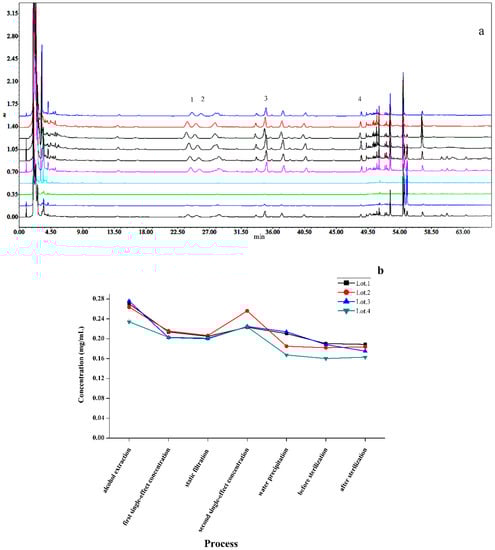 High-performance liquid chromatography photometric diode array (HPLC-PDA) chromatograms of (a) the sample solution of Panax ginseng extract intermediates including the processes of alcohol extraction (four times), first single-effect concentration, static filtration, second single-effect concentration, water precipitation, before sterilization, and after sterilization (1: Rg1, 2: Re, 3: Rb1, 4: Rd); the transfer process of (b) Rg1, (c) Re (d) Rb1, (e) Rd.