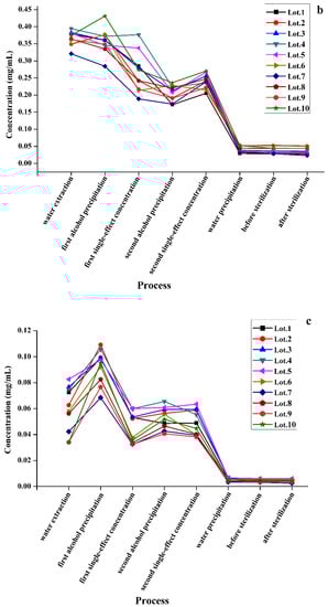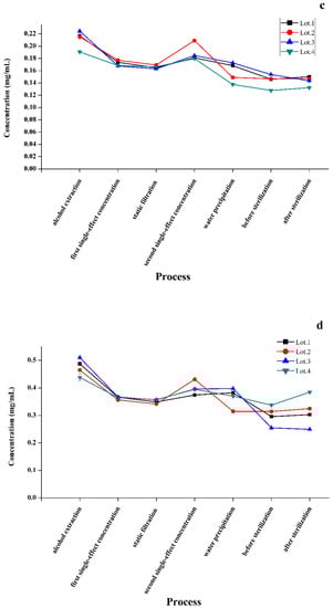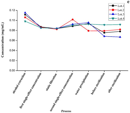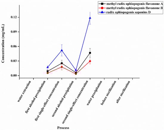 P. ginseng extract intermediates included the processes of alcohol extraction (four times), first single-effect concentration, static filtration, second single-effect concentration, water precipitation, before sterilization, and after sterilization. S. chinensis and O. japonicus extract intermediates contained the processes of water extraction (three times), first alcohol precipitation, first single-effect concentration, second alcohol precipitation, second single-effect concentration, water precipitation, before sterilization, and after sterilization (Figure 3). The contents of seven representative compounds in each procedure were quantified by high-performance liquid chromatography photometric diode array (HPLC-PDA) and HPLC-ELSD methods. According to the accumulated data in the process of production, their contents in the raw materials were reverted to the finished product. As shown in Figure 4, Figure 5 and Figure 6, the content of Rd changed slightly, but the content of Rg1, Re, and Rb1 were reduced in the transfer process and the percentage of variation was nearly 50%. However, SolA and SolB exhibited a downward trend in contents, the process of water precipitation had the greatest influence on SolA and SolB. After the process of water precipitation, the contents of SolA and SolB were also steady and close to zero. The content of Fru also varied slightly after the process of water precipitation.