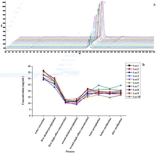 HPLC coupled with evaporative light scattering detector (HPLC-ELSD) chromatograms of (a) the sample solution of Ophiopogon japonicus extract intermediates including the processes of water extraction (three times), first alcohol precipitation, first single-effect concentration, second alcohol precipitation, second single-effect concentration, water precipitation, before sterilization, and after sterilization (1: Fru). The transfer process of (b) Fru.