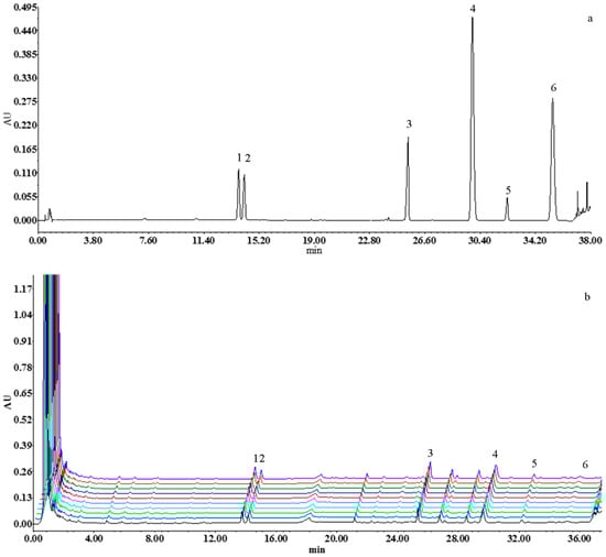 Ultra-performance liquid chromatography diode array detection (UPLC-DAD) chromatograms of (a) the mixed reference solution, (b) the fingerprint of ten batches of SMI (203 nm, 1: Rg1, 2: Re, 3: Rb1, 4: Rd, 5: SolA, 6: SolB).