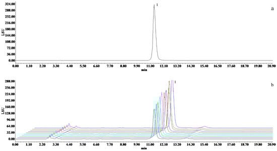 HPLC-ELSD chromatograms of (a) the reference solution of fructose, (b) the fingerprint of 10 batches of SMI (1: Fru).
