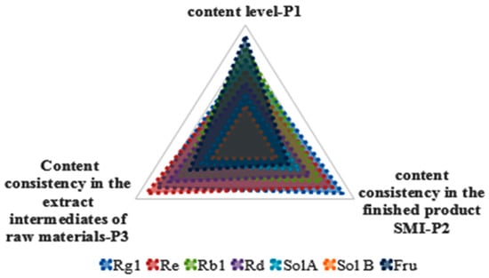 The procedure of water precipitation had the most significant impact on the seven representative components transfer process, which was crucial to the production process control of SMI. Then, in reference to the “Spider-web” mode which was proposed by Jiang et al., we comprehensively evaluated seven representative components to select Q-markers by the dimensions of content level, content consistency in the extract intermediates of raw materials, and the finished product SMI (Figure 10) [7]. We compared the contents and RSD% of seven representative compounds in 10 batches of SMI to obtain the rank value, and calculated the RSD% of seven representative compounds in different processes of four batches of P. ginseng, 10 batches of S. chinensis, and O. japonicus, the average value of RSD% was taken to assess compounds. Regression area (A) of seven representative components in the “Spider-web” mode could objectively reflect the contribution of components in SMI. The bigger regression area suggested the most important contribution. The variables’ coefficient variation was a parameter to reflect the dispersion degree of different variables of the tested compound. The smaller coefficient variation (CV) implied that the compound was qualified to be Q-marker. The importance index (IMI) was employed to discriminate Q-markers, ImI = A × 1/CV, We investigated the seven compounds from three dimensions to obtain IMI. Based on the IMI, the sequence was Rg1 > Rb1 > Re > Rd > SolA > Fru > SolB (Table 3). SolB had the lowest score in all three dimensions, and it was not recommended as a Q-marker. It had been shown that Rg1 could regulate mitochondrial dynamics imbalance via modulation of glutamate dehydrogenase and mitofusin 2 to prevent myocardial hypoxia/reoxygenation injury [14]. Re had many beneficial pharmacological effects on antiarrhythmia and cardiac electrophysiological function [15]. Rd and Rb1 contributed to the attenuation of cardiac hypertrophy [16,17]. SolA was able to inhibit cytochrome P450-3A4 activity without altering cellular glutathione level [18]. Low-fructose diet in subjects with chronic kidney disease could reduce inflammation with some potential benefits on blood pressure [19]. According to the pharmacopoeia and related literature along with the active ingredients, components transfer process in the SMI manufacturing process and comprehensive evaluation by “Spider-web” mode, six representative compounds were chosen as the Q-markers, and the UPLC-DAD and HPLC-ELSD methods were developed for the quality assessment and control of SMI. However, these methods also had limitations. Firstly, UPLC-DAD at 203 nm was not the maximum absorption wavelength of SolA and SolB. Secondly, fructose not only existed in O. japonicus, but also P. ginseng and S. chinensis. Although fructose was not a specific component of O. japonicus, the content in O. japonicus was much higher than P. ginseng and S. chinensis (Figure 11).