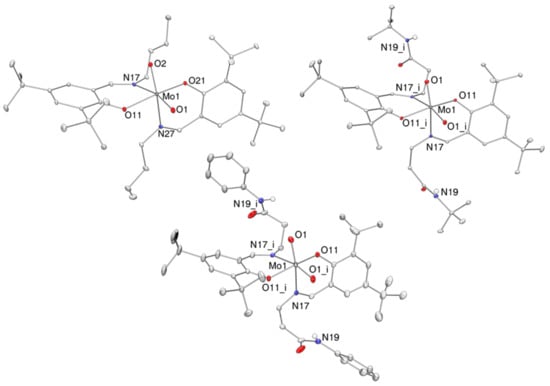 Molecular views (50% probability level) of the dioxidomolybdenum(VI) complexes [MoO2(L1)2]15 (1, top left), [MoO2(L2)2] (2, top right) and [MoO2(L3)2] (3, bottom). H atoms, except amide protons, as well as solvent molecules are omitted for clarity reasons.