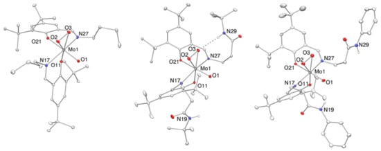Molecular views (50% probability level) of the oxido peroxido molybdenum(VI) complexes [MoO(O2)(L1)2] (9, left), [MoO(O2)(L2)2] (10, middle) and [MoO(O2)(L3)2] (11, right). H atoms, except amide protons, as well as solvent molecules and OPMe3 (in 11) are omitted for clarity reasons.