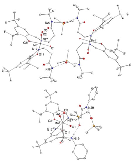 In complexes 1–3, the molybdenum atoms are coordinated in a distorted octahedral fashion by two bidentate ligands and two oxido ligands, with the iminophenolate ligands adopting the N,N isomeric form with respect to the oxido trans positions. Hydrogen bonding from the pendant amide functionalities to the oxido ligands is not observed. The bond lengths to all ligands are very similar in complexes 1–3; only the Mo–N bonds are slightly shorter in complex 3. The Mo=O bond lengths are within expected ranges (Table 1) [58].