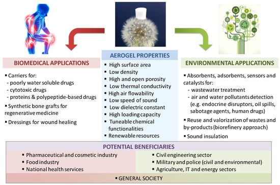 In biomedicine and environmental applications, the use of aerogel technology holds great promise to provide a compliant materials design platform in terms of yield, reproducibility and toxicity for satisfying the current social needs. The choice of the proper material science and technological approach to obtain an advanced material tailored for the envisaged biomedical or environmental application is claimed to give rise to important innovation breakthroughs in the field [31]. These advanced materials can be used in biomedical and environmental applications for several potential sectors (Figure 1).