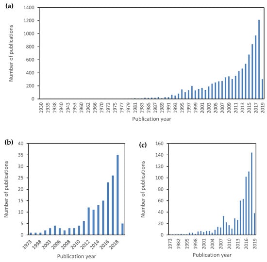 Trends in articles published worldwide on aerogels: (a) aerogels (search criteria: “aerogels”), (b) natural polymer-based aerogels (search criteria: “polysaccharide aerogels” OR “protein aerogels”), and (c) hybrid aerogels (search criteria: “hybrid aerogels”). Source: Scopus (search date: 26/02/2019).