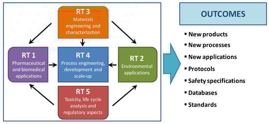 PERT chart for aerogels development in biomedical and environmental applications: research topics (RT, in text boxes), RT-interrelations (in arrows) and expected outcomes (right). Adapted from [31].