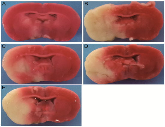 Triphenyltetrazolium chloride (TTC) staining results of brain tissue: The control group (A), model group (B), nimodipine group (C), high dosage of the ten-component combination derived from Naodesheng (NDS) (TCNDS) (H-TCNDS) group (D), and low dosage of TCNDS (L-TCNDS) group (E). H-TCNDS meaned high dosage of TCNDS (316.34 mg·kg−1·d−1), and L-TCNDS meaned low dosage of TCNDS (158.17 mg·kg−1·d−1).